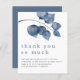 Blue Artsy Foliage Newlyweds Paper Obrigado A Um alternativo SMALLER de 4,5" x 5,6", amigo do orçamento. Disponível em um STOCK de PLACA SEMI GLOSS 110 lb ou um STOCK de PAPEL THINNER SATIN FINISH 80 lb. Os envelopes são um extra opcional. Estilo informal. Folhas azuis de cor grande moderna decoram a parte superior e a posição é grande abaixo em na moda com os detalhes na parte inferior. Personalize facilmente o texto para seus próprios detalhes.