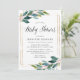 Na moda e chá de fraldas elegante com folhas de aquarela e ramos em tons vibrantes de verde escuro e lacre. Uma incrível estrutura de folha de ouro falso rodeia os detalhes do seu chá de fraldas para uma aparência perfeita para chás de fraldas de primavera e verão.