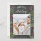 Cartão com fotos festivo apresenta bagas, folhas e galhos pintados com coloração aquosa, ao redor de sua foto favorita em um fundo de cinza escovado. "Feriados Mais Felizes" aparece no topo em letras brancas de bloco e tipografia de script. Personalize com sua saudação e nomes personalizados na parte inferior.