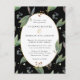 Cartão postal de casamento de cor aquática de eucalipto Elegante com loucos de folhagem e goma em fundo preto. Dourado quadro e roteiro ornamental.