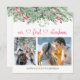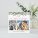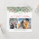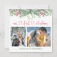 O nosso primeiro Cartão com fotos de Natal. Este design apresenta ilustrações aquarelas de folhagem verde e bagas vermelhas. O texto "nosso primeiro natal" é escrito em estilo caligráfico. Coloque as fotos abaixo para completá-las.
