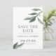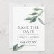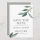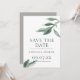 Um anúncio limpo, elegante e moderno salva o anúncio da data, com folhas detalhadas de cor da água verde sobre fundo branco, e elegante texto de cinza escura. O inverso está em cinzas sólidas.