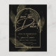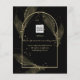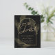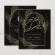Apresentando um item de casamento black tie formalmente suave com cores preto e dourado adornado com delicadas folhas de esqueleto dourado sobrepondo as bordas de uma moldura arqueada. Este design faz parte de uma coleção coordenada e inclui itens como cartões de RSVP, avisos de "salve a data", convites, sinais de boas-vindas, adesivos, guardanapos, programas, cartões de número de mesa, sacos de lembranças, menus e rótulos de garrafa de vinho, bem como uma variedade de tipos de cartões e papéis para se adequar a qualquer orçamento.