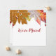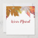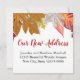 Folhas coloridas estão no topo de ambos os lados. Na frente, o texto de exibição diz "Nós nos movemos". Você pode mudar a mensagem. No verso, a mensagem diz Nosso Novo Endereço. Você pode editá-lo. Também há espaço para seu nome e novo endereço.