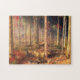 Raios de luz quente do sol do outono passam pelas árvores amarelas e vermelhas na borda da floresta e iluminam as folhas caídas no chão da floresta. Mais profundo na floresta onde as sombras são mais escuras ainda há vislumbres de ouro e cremson.