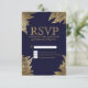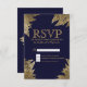 Design de ouro falso simples, moderno e elegante com padrão de forma de folha desenhada em marinho azul, Cartões RSVP. Este design clássico e sofisticado é perfeito para qualquer evento de na moda e tendências, incluindo casamentos e ocasiões cotidianas.Personalize com sua própria mensagem na frente assim como um monograma personalizado na parte de trás. Todas as impressão de fotos.