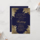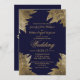 design de ouro simples, moderno e elegante com formato de folha desenhado em azul marinho, convites de casamento. Este design clássico e sofisticado é perfeito para o casal de competição de tendências e na moda. Personalize com sua própria mensagem na frente, assim como um monograma personalizado na parte de trás. Todas as impressão design.
