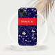 Fundo azul escuro com folhas amarelas claras e cor-de-rosa pastel e flores feitas de corações. Grande faixa horizontal vermelha próxima ao topo com texto personalizável.