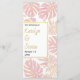 Folhas tropicais cor-de-rosa e programa de casamento de ouro. Este design é bonito com folhas de Split Leaf Philodendron (Monstera deliciosa) ou de Queijo Suíço e folhas de palma, cor-de-rosa-claro, com contorno dourado. A sua redação está num quadro branco com contorno dourado. O verso exibe um padrão de bolinhas dourado.