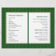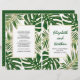 Folhas tropicais, cerimônia de casamento de ouro e dois programas de festas. Este belo design exibe folhas de Split Leaf Philodendron (Monstera deliciosa) ou de Queijo Suíço e folhas de palma em verde com contorno de ouro. No dentro existe um padrão de bolinhas ouro sobre um fundo verde e a sua redação está em um quadro branco com contorno de ouro. Escolha-o para a sua praia costeira tropical ou para o seu casamento de destino. Dobre no centro para ter um programa de casamento de estilo dobrado. Escolha apenas este tipo de valor de papel à medida que ele se dobra bem.