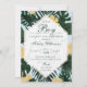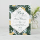 É um convite de chá de fraldas para garotos projetado com botânicos ricos em água e luxuosos de verde-folha de palma tropical e folha de ouro falso hibiscus flores tropicais estão maravilhosamente organizados para criar este design de convite para o chá de fraldas de bebê ousado, moderno e na moda. As palmeiras tropicais são dispostas para criar uma moldura na moda que apresente os detalhes do convite mostrados num fundo texturizado de mármore falso. Uau, com essas lindas, elegantes e tendas folhas tropicais... design de chá de bebê menino. O verso apresenta um padrão de linha geométrica exclusivo contra um fundo azul pálido para complementar o trabalho de arte frontal. Todas as ilustrações contidas neste convite para chá de fraldas verde tropical são obras de arte originais desenhadas à mão pela Moodthology. Você pode personalizar o tamanho do texto, a cor do texto, a fonte e o layout para sua preferência de design pessoal.