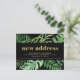 Esta mudança de endereço tropical moderna apresenta um quadro de monstera moderna e outras folhas tropicais verdes com linhas de ouro falsas sobre fundo negro e escuro. As palavras "novo endereço" aparecem na moda e contemporânea tipografia de ouro falso. Um anúncio simples, mas na moda, que terá orgulho de enviar aos amigos e à família.