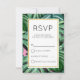 Um simples cartão de RSVP de casamento com um fundo pintado com folhas tropicais pintadas em verde. Uma moldura branca sobreposta com uma borda de folha de ouro falso.