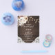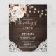 O convite de casamento ruidoso de Boho contém luzes de cordas, flores neutras e grama de pampa em fundo de madeira.