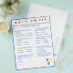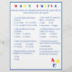 Design apresenta um fundo branco para uma borda azul e texto azul. O título é exibido em cores brilhantes. As perguntas são escolhas múltiplas e relacionam-se com o desenvolvimento do Bebê. A última pergunta, porém, é personalizável e é personalizada para as Mamães-a-Ser. As letras stenciadas, "ABC", são exibidas na parte inferior, no canto direito, em cores primárias. As respostas são encontradas atrás. Também disponível em vermelho. Projetado para coordenar com a "Coleção de Chás de fraldas ABC".