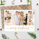 Folheto de Papel Feriado de Natal do Script de Caligrafia Elegante de Orçamento 5 Colagem de Fotografias. Este folheto festivo, minimalista, apresenta uma bonito colagem fotográfica de cinco (5) e diz "Feliz Natal"! O texto de saudação de "Feliz Natal" é escrito em um belo tipo de letra de rabo-de-coleira liso, escrito em Dourado e Branco. No lado inverso, desenhava-se um padrão de rabisco de pinheiros. Bonito cartão de boas-vindas para sua família e amigos na temporada de festas de inverno.