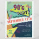 Folheto temático do Partido 90, com tipografia divertida do "Partido dos 90''. O design inclui elementos de blues, laranjas e pinks, bordas amarelas, cortadas, padrões geométricos e formas inspiradas na década de 90. Inclui um modelo para personalização pessoal.