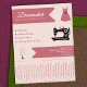 Um panfleto para costurar com tiras rasgadas e ilustração de uma máquina de costura, um manequim de costura e um vestido com pinos de costura sobre um fundo de rosa claro. Perfeito para atividades como costureira, alterações, reparações, desenhador de moda, alfaiate, costura feita à mão, etc.