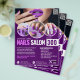 Leva os esforços de promocional do salão de unhas para o próximo nível com este fantástico panfleto para Nail Salon! Este panfleto de chamas de atenção é essencial para técnicos de unhas, manicuristas e artistas de unhas que querem destacar sua expertise e atrair novos clientes. Nossa modelo de panfleto mostra uma tom cativante de roxo que irradia elegância e atrai a atenção. Você pode personalizar facilmente o folheto com as informações de contato do salão, incluindo o endereço, o número de telefone ou o site. Com esta Modelo de Flyer de Salão de Púrpura, você vai deixar uma impressão duradoura na sua comunidade local.