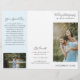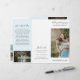 Folheto de fotos modernas triplicando com uma foto na frente com seu nome comercial acima e o título do folheto abaixo, sobre um fundo branco. O painel traseiro externo tem suas informações de contato com o cabeçalho em uma fonte elegante escrita à mão. O painel dentro tem um modelo para informações junto com uma foto na parte inferior sobre um fundo azul pastel. O dentro tem uma imagem nos painéis esquerdo e direito, juntamente com um modelo para informações à esquerda, seus pacotes no meio e uma lista de preços A la carte no painel direito. Este folheto profissional é perfeito para um fotógrafo de casamento.