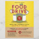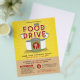 O folheto de doação da unidade de comida apresenta comidas enlatadas, fundo amarelo, caixinha marrom e um script vermelho de "comida drive". O objetivo do Flyer é promover doações de comida para alimentar os famintos.