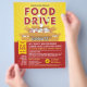 O folheto de arrecadação de fundos da unidade de comida vermelha e amarela apresenta caixas de papelão carregadas com comidas enlatadas. O objetivo do Flyer é promover doações de comida para alimentar os famintos.