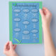 Um gráfico simples mas adorável com todos os tipos de dicas aromaterapy listadas. Ele nos diz quais aromas e óleos essenciais devem ser usados para insônia, picadas de insetos, depressão e seis outros. Inclui manjericão, limão, bergamota, árvore de chá, canela e muitos outros. Oferecemos isso como panfleto, cartão postal e cartão de saudação, para que você possa enviá-lo aos seus clientes, e como poster de tamanho de cheio. Você escolhe se deseja enquadrá-lo ou não.