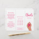 Brochura moderna em triplo salão de unhas, com um simples design com uma ilustração de uma mão com unhas cor-de-rosa fuschia segurando uma garrafa de verniz de unhas juntamente com "Unhas" pelo seu nome no roteiro na página cobrir. O painel traseiro tem suas horas de operação e informações de contato. O painel da dobra interna tem dois cabeçalhos e caixas de texto. O dentro tem vários modelos para obter informações sobre sua empresa nos painéis externos e uma lista de preços no painel do meio. Ambos os lados têm guias dobráveis que podem ser removidos clicando no botão "personalizar". Todo texto é rosa quente sobre fundo branco.