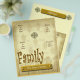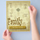 Este folheto celebra a família. Tem um visual vintage com um esquema de cor de bronzeado e ouro. Baixe suas próprias imagens ou simplesmente remova o texto e adicione seus outros elementos manualmente mais tarde. Edite o texto, use um fundo de cor simples se desejar. O fundo é o chá manchado de cor bronzeada com uma sutil tipografia com relações familiares. Há também uma silhueta esmaecida de árvores no fundo. Há um medalhão de ouro no centro da parte superior da design. Você pode remover o medalhão para um olhar mais simples. Você também pode adicionar informações no verso.