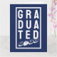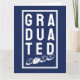 Para os recém-formados. Um cartão de felicitações para um graduado diz "graduado" e mostra o ano de graduação. O design está contido dentro de uma moldura oblonga. Letreiro branco.