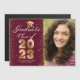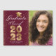 Anuncie sua graduação em estilo com este elegante cartão magnético de anúncio personalizado de fotos. Esta design tem sua foto à direita e à esquerda é uma tipografia branca e dourada com as palavras "Classe de Formando de 2023" com seu nome e escola para personalizar acentuado com um boné de formando dourado falso sobre fundo de marrom vermelho. A parte de trás do cartão é marrom. Desenhada por Susan Coffey.