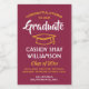 Adicione um toque personalizado às decorações da festa de formação da faculdade ou do ensino médio com estes rótulos elegantes para mini garrafas de vinho nas cores grená, branco e dourado. O design apresenta um fundo vermelho burgundy, um gorro de formatura amarelo, tipografia moderna e estilosa, caligrafia cursiva manuscrita e uma mensagem personalizável que diz "Parabéns ao nosso Graduado". O texto na parte inferior inclui o ano da turma, nome da escola e linhas opcionais para grau, tipo de bebida ou outras informações. Todo o texto é fácil de personalizar. Estes rótulos são uma ideia estilosa para bebida na festa de formatura e um complemento elegante para a celebração do dia especial do graduado. Parabéns!