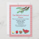 Comece a comemorar ou fique junto com este adorável convite de piquenique ao ar livre. Está colocado fora com um fundo azul claro. Há uma borda de mesa vermelha e branca. Há 4 formigas na parte inferior, cada uma segurando diferentes itens de comida. Uma tem uma cunha de limão nas costas, a segunda uma maçã, a terceira tem um pedaço de bolo de chocolate, e a última tem um pedaço grande de melancia. Um ramo de uma árvore está espiando o canto superior deste convite. Confira a quantidade de outros designs nesta linha. ©babystar designs