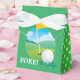 Perfeito para excursões de golfe, festas de aposentadoria e aniversários. Este é um design de estilo tenda com um fundo verde. Na frente e atrás há uma imagem de um verde de golfe. No primeiro plano há uma bola de golfe e a palavra "FORE the Golfer". Os dois painéis laterais têm círculos verdes claros.