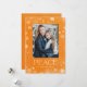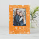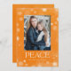 Imprima todos na sua lista de cartões de Natal com um elegante cartão com fotos de festas de neve. O cartão de feriado exclusivo mostra sua foto favorita da família na frente com flocos de neve brancos na borda contra um fundo de cor d'água laranja. "Paz" é apresentado numa letra serif moderna de tendência com o seu nome ou texto personalizado mostrado abaixo. A parte traseira da placa de feriado do floco de neve contém uma foto adicional com sua mensagem personalizada em texto branco contra um fundo de cor d'água laranja. O design coordena-se com a nossa coleção de cartões de Natal da Paz do Fosco.