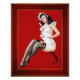O Maid do pintor americano Peter Driben (1903 - 1968); pintor, ilustrador e um dos mais prolíficos artistas de pin-up dos anos 1940 e 1950. Uma ilustração atraente e sensual de uma beleza cabeleira feita em um uniforme de empregadas mais revelador. Ela tem ao redor do cabelo uma fita rosa larga que gravatas por um arranjo floral no topo da cabeça. O uniforme das empregadas brancas tem um profundo corte de v no centro e é sem dormir, com apenas alguns de cima devem brilhar com sotaques vermelhos rufados nele. Ao longo dos lados perto de seus quadris estão três ovais de corte que se tornam progressivamente grandes de cima a baixo e os bolsos do uniforme em que ela tem as mãos atadas têm aparas vermelhas rochedas ao longo da borda superior. Ela está sentada na borda de um feixe de madeira curvo, ao revelar suas belas pernas que se cobriam em meias escuras bem acima de sua coxa, com uma banda laranja na coxa esquerda; além de vestir calçados de salto alto de corda abertos em preto. O fundo da imagem é um abstrato vermelho leve com traços laranja finos em volta do corpo.