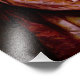 Uma mulher em um vestido de cetim vermelho com um xale transparente segura um buquê de flores enquanto sopra uma grande bolha de chiclete. A roupa e o penteado históricos sugerem uma época passada, mas o chiclete introduz uma reviravolta lúdica e moderna.