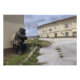 Um fuzileiro posta a segurança como uma equipe de fuzileiros se prepara para entrar em um armazém inimigo com base.