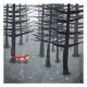 Uma raposa vermelha selvagem se situa entre as árvores de uma floresta escura. Uma pintura paisagística para amantes de animais, natureza e vida selvagem.