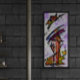 Bold, vibrant colors and dynamic brushstrokes create an abstract composition on a vertical canvas. Swirling patterns in purple, red, and black intertwine with geometric elements.