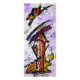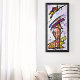 Bold, vibrant colors and dynamic brushstrokes create an abstract composition on a vertical canvas. Swirling patterns in purple, red, and black intertwine with geometric elements.