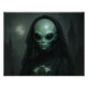 Esta trabalho de arte retrata uma figura feminina alienígena num estilo gótico e místico requintado. Ela tem uma cabeça acesa e olhos grandes, escuros e de outro mundo, sua pele é um verde pálido que contrasta assombrosamente com seu traje. Ela veste um vestido preto de alto-colar, intricadamente padronizado, com capas de rendas esfoladas e um corpo cortado, evocando o luto vitoriano. Um véu preto puro corta-se sobre a cabeça e os ombros, reforçando a sua presença espectral. Ao redor do pescoço pendura um pingente surpreendente - um pentagrama grande envolto em círculo, descansando sobre uma delicada lixeira. Atrás dela, sob o brilho estranho de uma lua de cheio, suba as silhuetas das torres da catedral gótica, adicionando profundidade à atmosfera escura e ritualística. A composição global mistura traços extraterrestres com elegância oculta, fazer ela parece tanto regal quanto inquietante, como um grande sacerdote de outro mundo