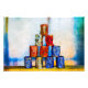 Pirâmide de latas vazias de sopa. Algumas latas são pintadas, outras são passadas por tiro. Aparentemente, serviram como alvos de formação. Outra interpretação do famoso tema da pop.