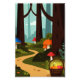 The forest features tall trees and mushrooms in various colors, including blue, red, and orange.