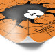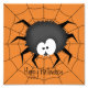 Aranha preta de desenho animado caprichoso com olhos grandes e engraçados e presas brancas pequenas, rastejando pela sua teia. Abaixo da aranha há um modelo que diz Feliz Halloween. Isso pode ser usado como está ou substituído pelo seu próprio texto.