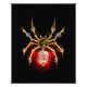 Aranha mecânica, com pá-pá de ouro, engrenagens de latão e uma lâmpada de vidro vermelha sobre fundo preto. Estilo Steampunk.