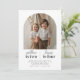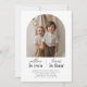 Um moderno convite conjunto de Aniversário que apresenta sua própria foto em forma de arco com o nome e a idade dos amigos ou irmãos, com os detalhes abaixo.