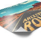 This bold graphic illustration captures the iconic feel of an endless Arizona road cutting through a vast desert landscape. Cracked yellow road lettering, dramatic red rock formations, and a striking turquoise sky create a powerful sense of solitude, freedom, and adventure. The symmetrical composition and stylized details draw the eye forward, evoking classic American road trips, Southwest travel culture, and the spirit of open highways.
