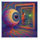 "Através do Prismo da Visão". Banhada em ondas de cores vibrantes de laranja, vermelho e azul, uma mulher fica descalça na borda de um túnel espelho infinito. Os olhos colossais olham para trás sem parar, suas reflexões se estendem além da visão sobre o futuro. Um olho menor e deslocado repousa no chão, lembrando calmamente que a percepção nunca é imperfeita, e toda visão carregar suas próprias distorções.