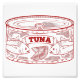 Uma ilustração de uma lata de atum. Esta design é vermelha e branca e tem uma lata de atum com dois peixes e uma fatia de limão nela. Desenhado no estilo de um poster de publicidade de comidas retrógrada ou de de de vintagem.